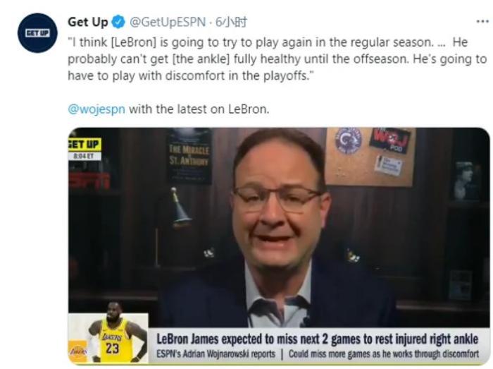 可是不好的消息是,名记WOJ在社交媒体上表示,经过检查治疗和拜访名医,詹姆斯脚伤本赛季不能痊愈,詹姆斯将不得不带伤打季后赛,老詹的伤病治疗将延后到休赛期,而这带来最直接的反应是詹姆斯将缺席湖人背靠背的两场比赛,这也给浓眉哥等湖人球员提出了新的挑战,毕竟这两场球如果输了,湖人队将有很大的概率将前往附加赛报道。