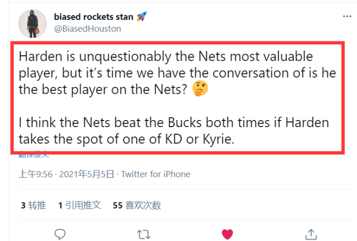 “哈登毫无疑问是篮网全队最有价值的球员,但现在是时候讨论他是篮网队最强的球员了吗?个人认为如果哈登取代杜兰特或欧文其中任何一个,篮网这两次都能击败雄鹿。”