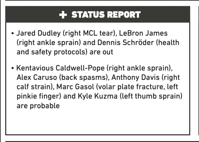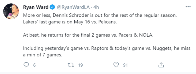 施罗德因健康安全协议被隔离,最新消息是要缺席10-14天的比赛。对于湖人来说, 是又一重创。湖人记者Ryan Ward指出,施罗德有可能常规赛报销,湖人最后一场常规赛是在当地时间5月16日。最好的结果,是施罗德还能赶得上参加最后两场常规赛(对手是步行者和鹈鹕)。包括昨天和今天的背靠背,施罗德至少要缺席7场比赛。