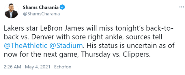 官宣!詹姆斯因踝伤缺战掘金!MVP排名下降 湖人卫冕概率只剩6%