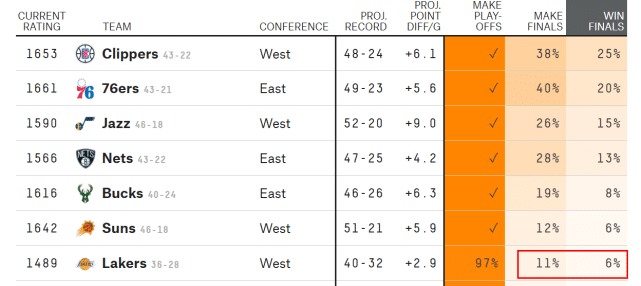 詹姆斯和施罗德都不能出战,也进一步影响了湖人的夺冠概率,数据网站FiveThirtyEight的最新夺冠概率排名显示,湖人已经跌至第7位,虽然他们有97%的概率晋级季后赛,但只有11%的概率打进总决赛,卫冕概率只剩下6%。