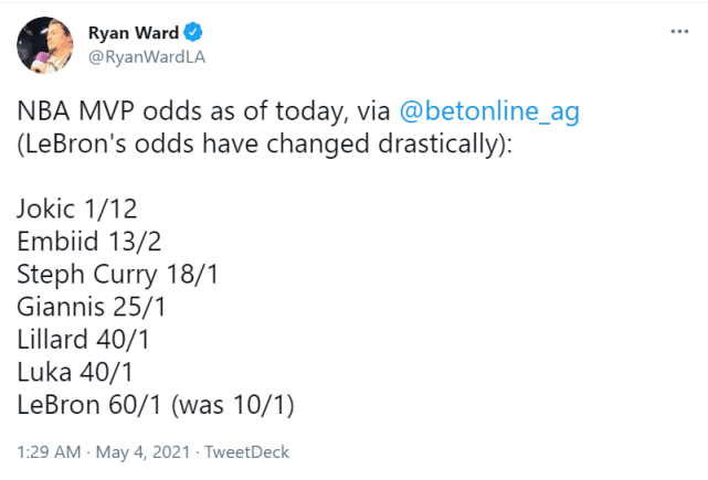 詹姆斯复出后再次伤停,也进一步影响了他的MVP赔率排名。最新的MVP赔率显示,詹姆斯是60/1(之前是10/1),已经跌至第七位,在他前面的依次是约基奇、恩比德、库里、字母哥、利拉德和东契奇。詹姆斯自身的伤病问题,再加上湖人越来越糟糕的战绩,已经让这位36岁的球星离MVP奖杯越来越远。