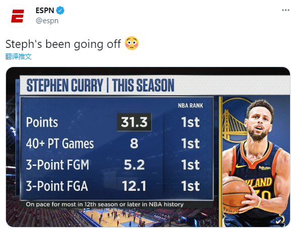 赛季至今,库里场均31.3分力压比尔领跑联盟得分榜,8次单场40+、场均命中5.2记三分以及场均出手12.1次三分,这都排在联盟第一;勇士战绩不佳,但33岁库里打出生涯代表赛季,场均31.3分5.5篮板5.8助攻1.2抢断,比当年全票夺得MVP的赛季还疯狂。