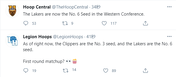 由于湖人掉到西部第六,美媒第一时间发推写道:湖人西部第六,快船西部第三,难道洛杉矶双雄季后赛首轮对决吗?