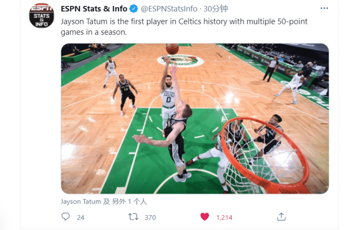 另外,塔图姆本赛季之前对阵森林狼的时候有过53分的表现,加上今天的60分,他也成为了凯尔特人队史第一位单赛季多次砍下50+的球员!强如比尔拉塞尔、拉里伯德、皮尔斯等这样的队史巨星都从来没有做到过啊!