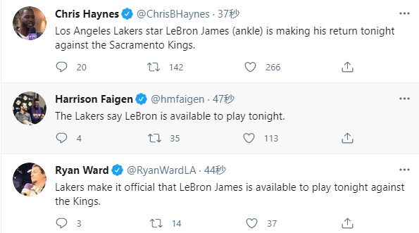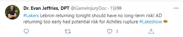 为了今天复出,詹姆斯也是拼的——先是在湖人训练馆训练了一个小时,然后提前3个小时到斯台普斯球馆热身,最终詹姆斯决定今日复出,这意味着他的脚踝伤势已经彻底痊愈;另外医学专家Evan Jeffrises发推写道:詹姆斯今天复出不会有长期风险。