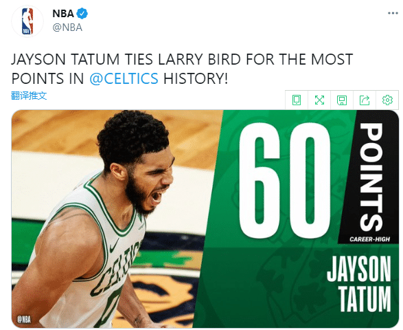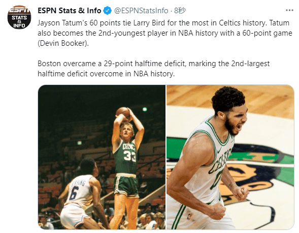 第三、塔图姆单场60分追平名宿拉里-伯德,并列成为队史单场得分王。