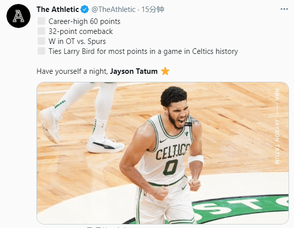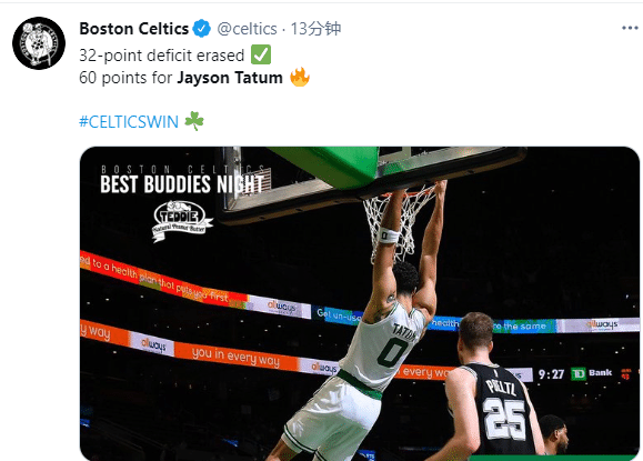 凯尔特人官方晒数据狂吹塔图姆,众美媒也转发塔图姆神迹,刷屏狂吹;NBA官方晒图恭喜塔图姆创纪录;塔图姆疯狂一战引爆全美,年仅23岁天赋满满,要是当初湖人用榜眼前选他该多好,还是安吉眼光毒辣;目前塔图姆已成绿军非卖品,他和布朗是波士顿的未来。