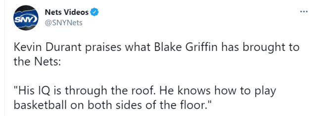 4大数据领跑全队!格里芬激活篮网替补阵容,杜兰特:他的智商太高了
