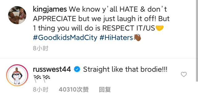 来源:24直播网04-30 17:4524直播网讯北京时间4月30日,湖人球星勒布朗-詹姆斯更新社媒,晒出自己与奇才球星韦斯布鲁克在比赛中的一张合影,两人有说有笑。詹姆斯配文写道:“我们知道你们都在讨厌&并不欣赏,但我们只是一笑而过!你们要做的唯一一件事就是表达尊重#好孩子疯狂城市#你好黑子们。”韦少也第一时间回复:“说得太对了,兄弟!”