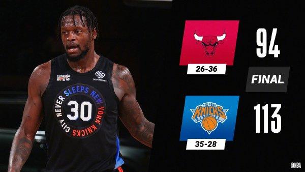 尼克斯这边多点开花,当家球星兰德尔又充当起急先锋重任,里突外投根本不可阻挡,全场36分钟投篮23中12,三分7中4狂砍34分7板3助,彻底碾压了公牛的防线。