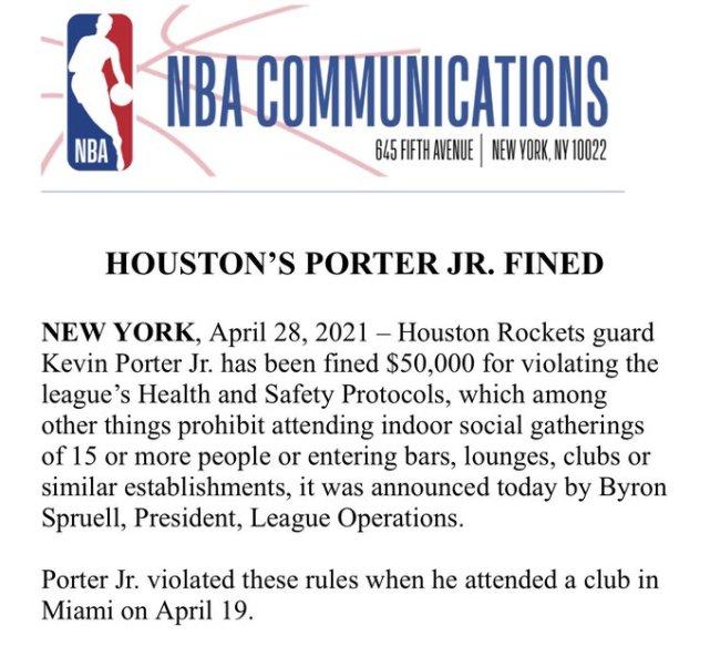 来源:24直播网04-29 12:1624直播网讯北京时间4月29日,NBA官方宣布,火箭球员小凯文-波特因违反联盟的健康安全协议而被罚款50000美元。官方声明中表示,波特于4月19日(当地时间)违规前往迈阿密的一家夜店。健康安全协议规定,球员禁止参加15人或以上的室内社交聚会,也不能前往酒吧、夜店等类似场所。