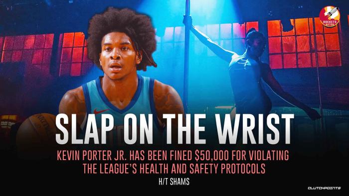 来源:24直播网04-29 12:0924直播网讯北京时间4月29日,NBA联盟官宣两笔罚单,火箭球员凯文-波特因违反联防疫协议而被罚款50000美元,绿军球员斯玛特被禁赛一场,1人因被殴打而逃出一劫;此前在4月20日,小波特在迈阿密违规逛夜店,斯特林-布朗就是在这家夜店外被殴打,联盟介入调查,最终仅仅只处罚小波特。