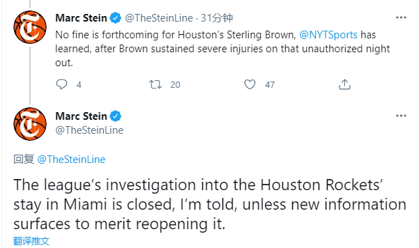 据名记报道,联盟针对斯特林-布朗的调查已经结束,最终只有小凯文-波特一人被罚款;为何斯特林-布朗没被罚款呢?名记表示联盟因斯特林-布朗遭受严重的伤害而免遭罚款;换句话说,斯特林-布朗确实违规了,但他惨遭殴打,面部多处被划破,血流不止,这是联盟的同情心。