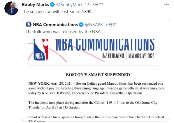 随后联盟又开出一笔罚单,凯尔特人主力球员斯玛特因在比赛中威胁裁判被禁赛一场,损失一场比赛的薪水,据薪资专家Bobby Marks报道,斯玛特将会损失8.9万美元,被禁赛从而缺席凯尔特人和黄蜂的比赛。