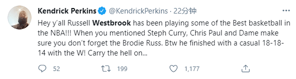 名嘴帕金斯发推写道:韦少一直在打NBA最好的篮球,当你们提到库里、保罗和利拉德时,一定不要忘记韦少;顺便提一句,韦少轰下18+18+14带队击败湖人。