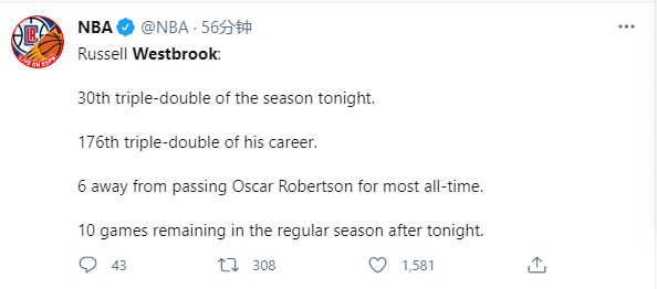 NBA官方也晒韦少三双神迹——单赛季30次三双、生涯176次三双,距离超越大O罗伯特森仅仅只差6次,奇才常规赛还剩下10场比赛。