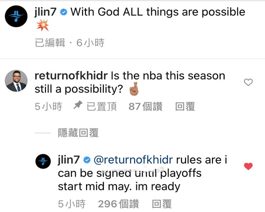 近日林书豪在社交媒体上回答球迷们的提问,就有粉丝提问称NBA这个赛季还可以吗?林书豪回应到: