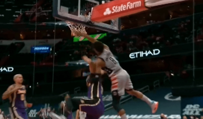 八村塁的这个球确实太霸气,从接到比尔的传球之后也就直奔篮筐扣篮,没有在意防守他的是联盟顶级巨星浓眉哥,丝毫不畏惧,直接隔扣成功,浓眉哥倒地之后非常尴尬,而这个球也堪称是八村塁本赛季的代表作。
