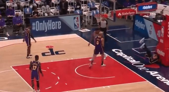 这是第三节还剩下8分52秒的时候,施罗德的三分球没有投进,比尔摘板之后长传前场快下的八村塁,八村塁迎着浓眉哥的防守,直接单臂抡圆了隔扣,也直接扣倒了浓眉哥,导致后者倒地。浓眉哥起初没有起身,因为他的鼻子被碰到了,之后才在队友的搀扶下起来了,湖人也进行暂停,让浓眉哥稍微调整下。