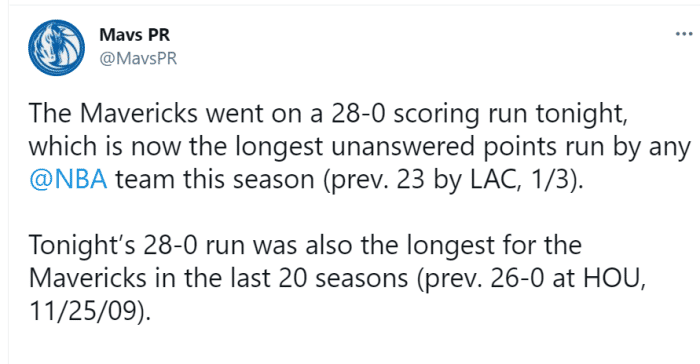 上半场的较量,勇士29比62落后独行侠33分!尤其第一节在一度12比11领先独行侠情况下,勇士在剩余接近9分钟的时间里一分未得,被独行侠轰出25比0的高潮!第二节,独行侠再次率先得到3分,加上第一节从而打出28比0的一波流,这也创造了本赛季最大零封对手得分的进攻高潮!此前快船曾打出23比0。28比0的高潮也创造独行侠近20年纪录,他们曾在09年对阵火箭打出过26比0。