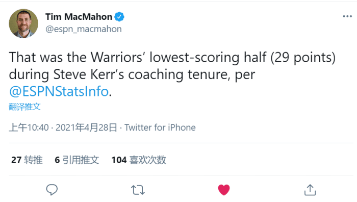 勇士半场仅29分是什么概念?据ESPN统计,这不仅是勇士本赛季半场得分新低,也是科尔执教勇士以来最低的半场得分!最重要的是,如果勇士今天输给独行侠,他们就会被独行侠拉开到3.5个胜场,在只剩下10场常规赛的情况下,基本意味着他们很难以前六的身份直接打入季后赛了!