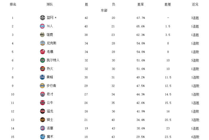 东部1-8名:篮网、费城、雄鹿、尼克斯、老鹰、凯尔特人、热火、黄蜂;