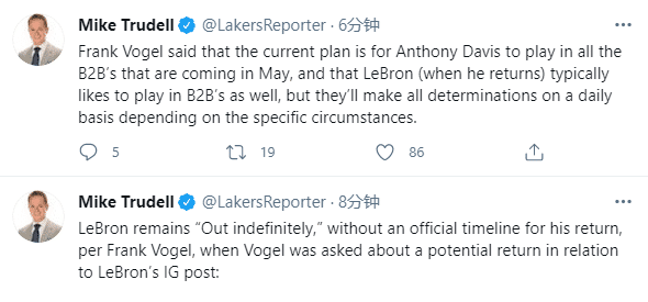 对于未来的比赛,沃格尔表示他会在确保浓眉健康的情况下,让其出战所有的背靠背比赛。詹姆斯复出后,只要条件允许,球队也会做出相同安排。