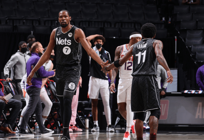 来源:24直播网04-26 15:5224直播网讯北京时间4月26日,NBA常规赛结束了一场比赛,篮网主场128-119战胜太阳,目前稳居东部第一。本场比赛欧文和杜兰特均表现出色,欧文全场比赛轰下34分6篮板12助攻,杜兰特替补出战贡献33分6篮板4助攻。