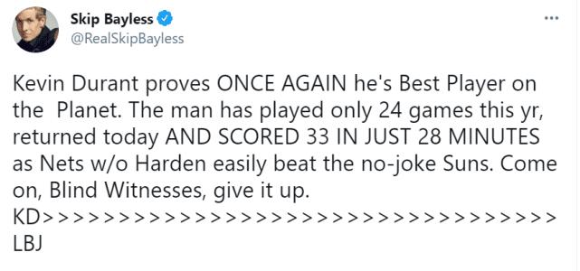 著名詹黑Skip写下推文“凯文杜兰特再次证明了他是地球上最好的球员,这个男人本赛季只打了24场球,今天回归就在28分钟内拿到了33分,篮网在没有哈登的情况下轻松击败了不开玩笑的太阳,拜托,盲目的见证者们,放弃吧,KD强于詹姆斯!”薪资专家鲍比马克斯“在五月下旬前,篮网都都得拿泡沫把杜兰特包好,28分钟内打出多么牛的表现啊!