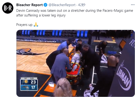 来源:24直播网04-26 14:3824直播网讯北京时间4月26日,魔术和步行者比赛中,场上发生意外受伤事件,魔术十天短合同球员德文-坎纳迪惨遭重伤,才上场仅打1分钟却不幸重伤离场,小腿严重受伤,被工作人员用担架抬离现场。