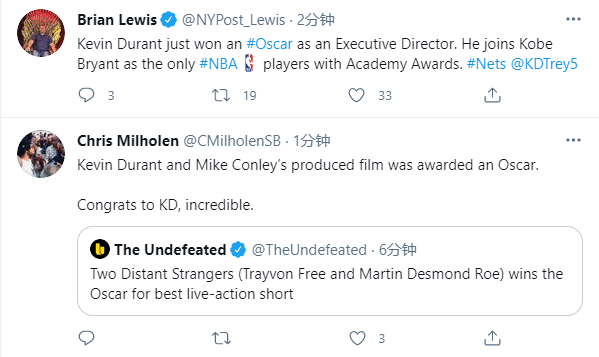 2018年,湖人队传奇巨星科比凭借《亲爱的篮球》获得奥斯卡最佳动画短片,成为首位获得奥斯卡奖的职业运动员,创造了历史,当初科比获奖后直言比赢得冠军更好。在今天的颁奖典礼上,杜兰特和迈克-康利一起获得奥斯卡荣誉,《两个遥远的陌生人》在短片类(真人秀)中获得奥斯卡奖。