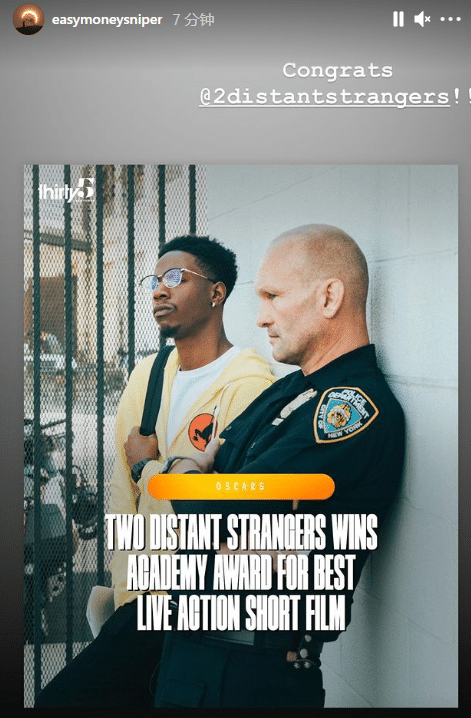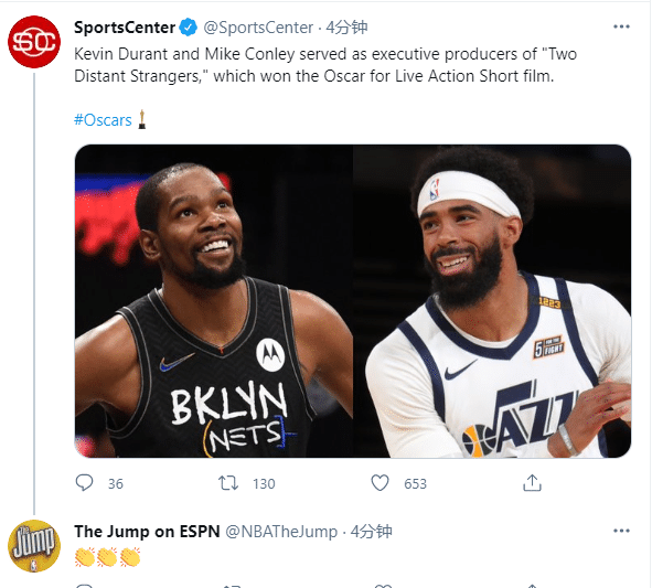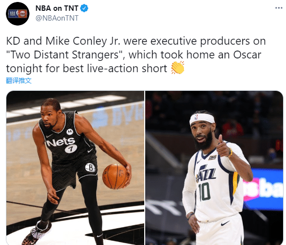 杜兰特和康利参与了电影《两个遥远的陌生人》的制作,这部电影获得《最佳真人短片奖》,因此杜兰特和康利都已执行制片人的身份获得奥斯卡;如此喜讯引热议,美媒刷屏祝贺杜兰特和康利获大奖,当今联盟只有他俩有此殊荣。