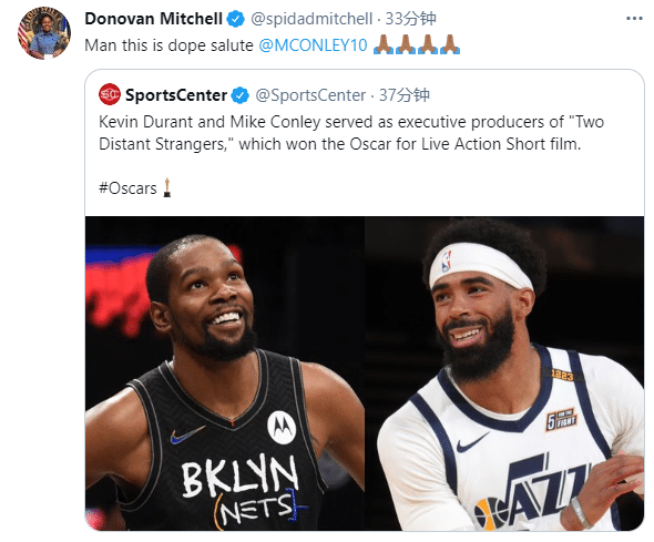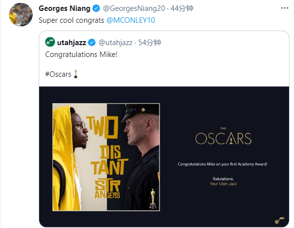 爵士官方恭喜康利获得奥斯卡,尼昂发推写道:超级酷,祝贺康利;米切尔发推写道:兄弟,这必须向你致敬。
