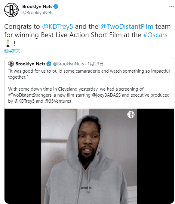 篮网官方第一时间恭喜杜兰特,又晒出3个月前全队在克利夫兰观看《两个遥远的陌生人》这部短片的画面,发推写道:恭喜杜兰特以及整个团队获得《最佳真人短片奖》.