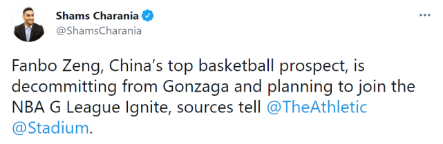 来源:24直播网04-25 16:5724直播网讯 北京时间4月25日,据The Athletic名记查拉尼亚报道,中国顶级年轻球员曾凡博将不会前往冈萨加大学,而是计划加入NBA发展联盟(G联赛)的点燃队。