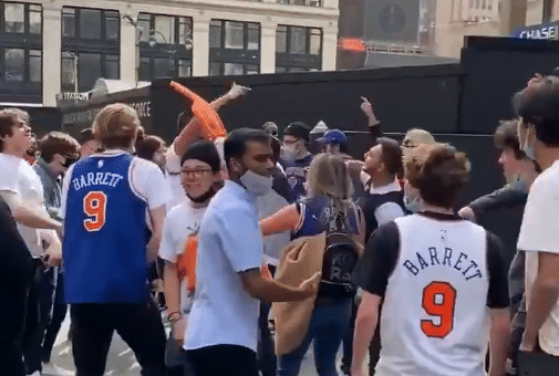 比赛结束之后尼克斯的球迷们上街欢庆,当然主要是一些年轻的球迷们,他们大部分人身穿的是9号巴雷特的球衣。这群球迷们聚集在一起之后开始欢呼,庆祝尼克斯夺得九连胜。