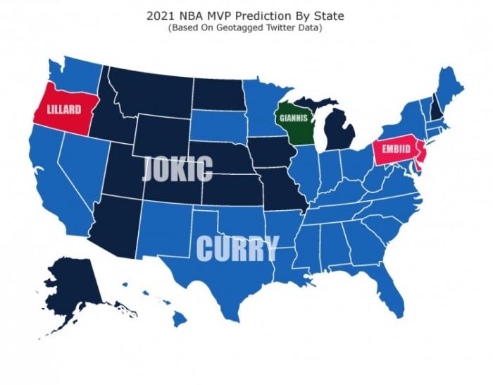 来源:24直播网04-24 15:0024直播网讯 对于NBA这种商业联盟来说,光有实力有些时候其实还是不够的,因为一个球星不仅需要赛场上的实力,在场外也需要有很高的人气。毕竟NBA很多奖项还有全明星的评选都需要人气来支撑,很多有实力却没有人气的球员可能都没办法进入全明星。而一家专门统计社交媒体数据的媒体就发布了一个NBA的本赛季MVP地图,上面有着美国各州球迷对于球星的支持力度,从这里可以看出这些州希望哪个球星拿到MVP。