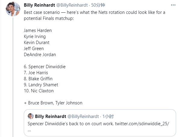 篮网有望在季后赛迎来最强阵容,三巨头合体以及关键伤员归来;对此篮网记者Billy Reinhardt预测篮网季后赛最佳轮换阵容:首发五虎是哈登、欧文、杜兰特、杰夫-格林和小乔丹;替补阵容是丁威迪、乔-哈里斯、格里芬、沙梅特、克拉克斯顿、布朗和泰特-约翰逊。