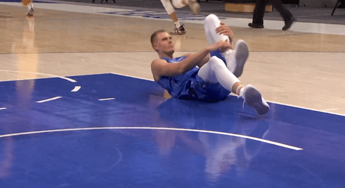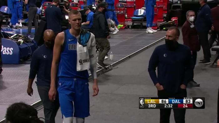 第三节还剩2分30多秒,波尔津吉斯在一次进攻中不幸崴脚,脚踝呈90度崴伤,捂着脚踝十分痛苦,随后他先是回到独行侠替补席,紧接着波神一脸沮丧,一瘸一拐走回更衣室;然后独行侠官方宣布,波尔津吉斯因左脚踝扭伤直接退出比赛;