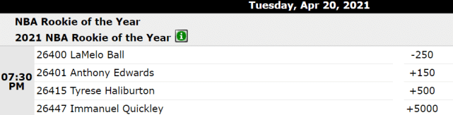 三球当选最佳新秀的赔率是-250,爱德华兹是+150,排名第二。哈利伯顿受赖特交易的影响,在队内的出场时间变得不稳定,赔率也有所下滑,+500位居第三。排名第四的奎克利,赔率达到+5000,属于基本没戏的竞争者。