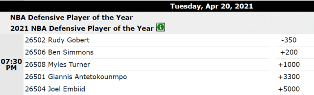 已经斩获两座最佳防守球员奖杯的戈贝尔,依然是最被看好的竞争者。他的赔率达到-350,高居第一。爵士的战绩和戈贝尔个人的数据,成为最好的筹码。位列第二的是本-西蒙斯,他的赔率是+200,是戈贝尔最强劲的竞争对手。