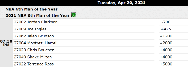 从赔率上看,这预计是悬念最小的奖项。战绩联盟第一的爵士,拥有联盟进攻最犀利的第六人之一,乔丹-克拉克森。克拉克森的当选赔率是-700,优势相当明显。他最大的竞争对手,是同在爵士的英格尔斯(+425),这一幕让人想起当初快船的哈雷尔和路威。
