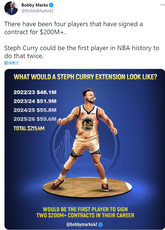 来源:24直播网04-22 19:0724直播网讯33岁库里还能拿到一份顶薪大合同吗?据薪资专家Bobby marks分析,库里有可能和勇士续签一份4年2.15亿美元的超级顶薪,若成功续签2亿顶薪,库里将会成为NBA历史上第一位拿到两份2亿顶薪的球员。