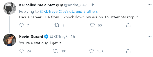 还有球迷列出数据,表示浓眉生涯三分命中率只有31.7%,而且场均只投1.5个三分。杜兰特很快回怼道:“我懂了,你就是个数据男。”有趣的是这个球迷很快把自己的网名改成“KD叫我数据男”。