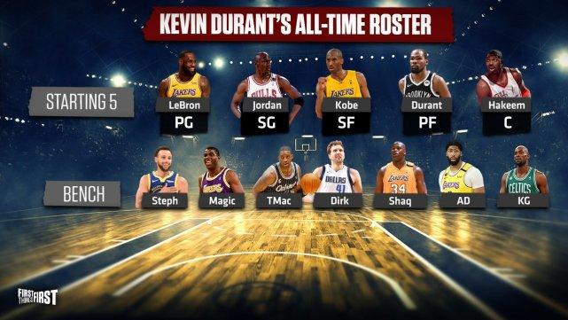 在近日的一次采访中,杜兰特列出了自己心中的历史最佳12人阵容。首发五虎是詹姆斯、乔丹、科比、杜兰特和奥拉朱旺;替补7人是库里、魔术师、麦蒂、诺维茨基、奥尼尔、浓眉和加内特。