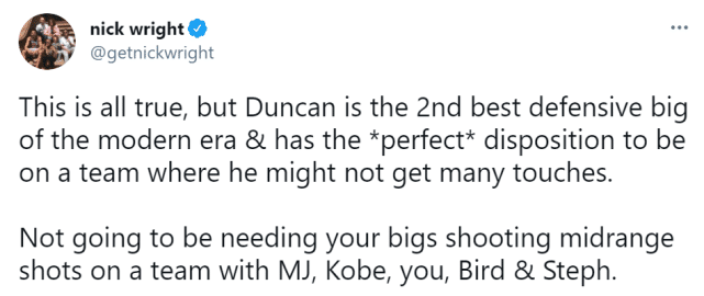 名嘴奈特也回应杜兰特:“你说得对,但邓肯是现代篮球里防守第二出色的大个子,他能完美匹配一个可能他没什么球权的阵容。另外,在一支包括乔丹、科比、你、伯德和库里的球队里,大个子的中投并不是必需的。”