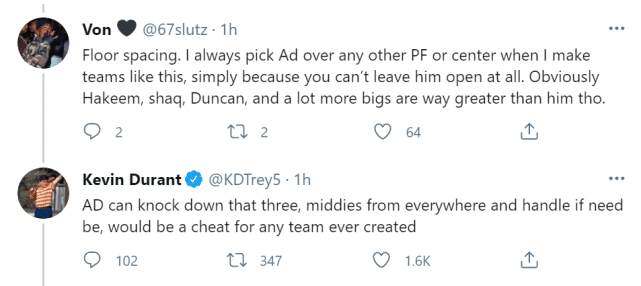 这一话题引起了球迷们的热议。一些球迷认为杜兰特不该把浓眉放进这个阵容中,虽然浓眉拉开空间是很厉害,但论及伟大,邓肯、大梦和奥尼尔还是远胜过他。杜兰特回应道:“浓眉可以投中三分和任何位置的中距离,如果有需要,他还能控球,无论打造什么样的阵容,他都可以成为一个作弊码。”