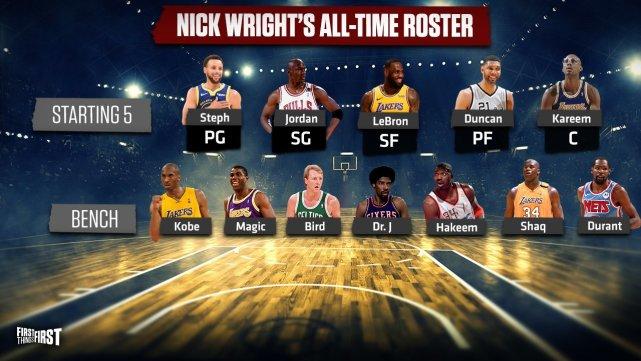 作为对比,NBA名嘴尼克-奈特也列出了他心中的历史最佳12人阵容。首发五虎是库里、乔丹、詹姆斯、邓肯、贾巴尔;替补7人是科比、魔术师、伯德、J博士、奥拉朱旺、奥尼尔和杜兰特。