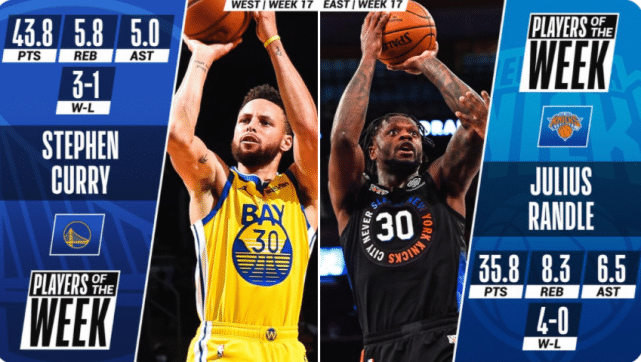 NBA官宣周最佳!库里场均43.8分无悬念当选 兰德尔生涯首获殊荣
